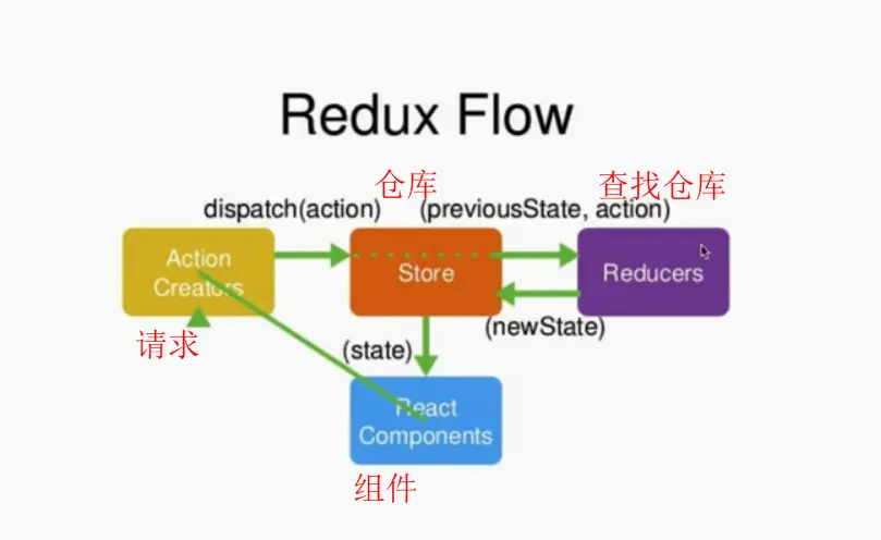 Redux的原理其实就是把数据放在一个仓库中(类似于Vuex),组件可以在任何地方储存和提取仓库中的内容,具体关系看下图: