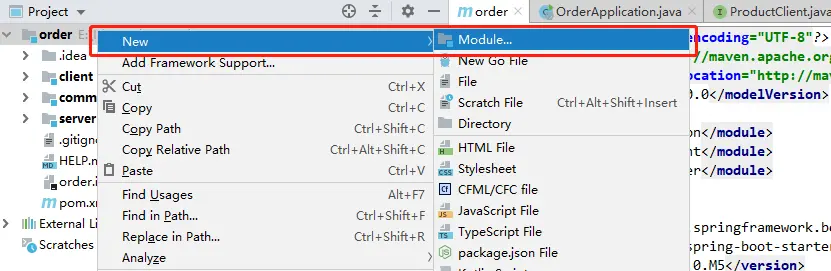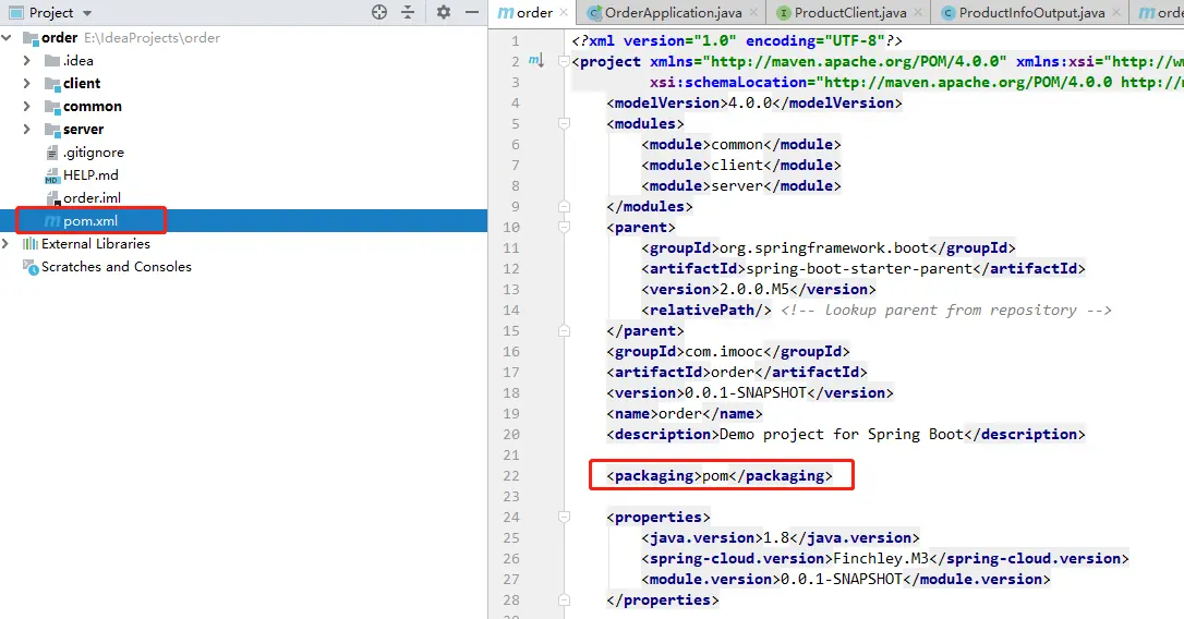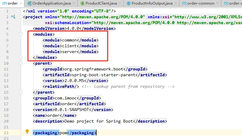 例如:我将order项目拆分成三个不通的子模块,即common、client、server,每个模块负责的事情是不同的