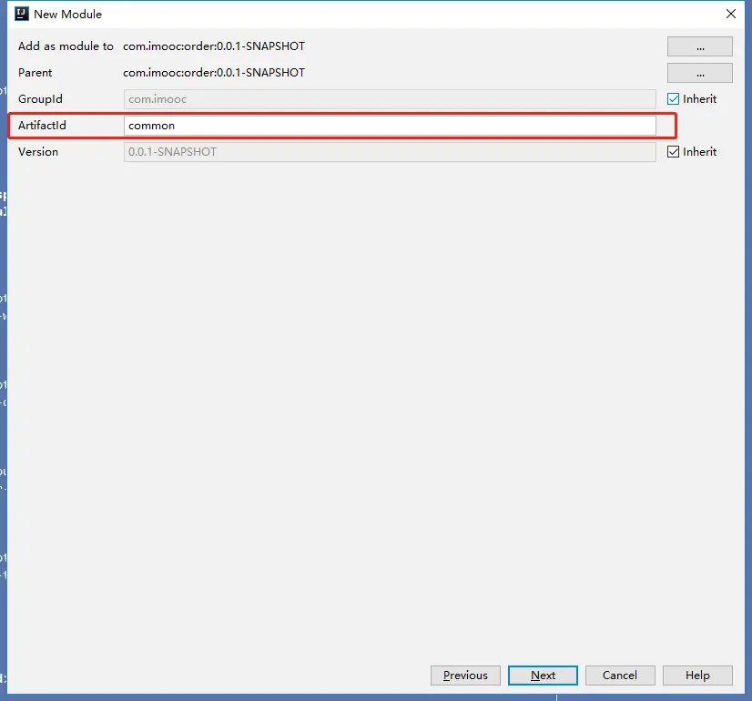 第三步:点击Next,并输入子模块的ArtifactId,如:common、client、server等,然后点击Next