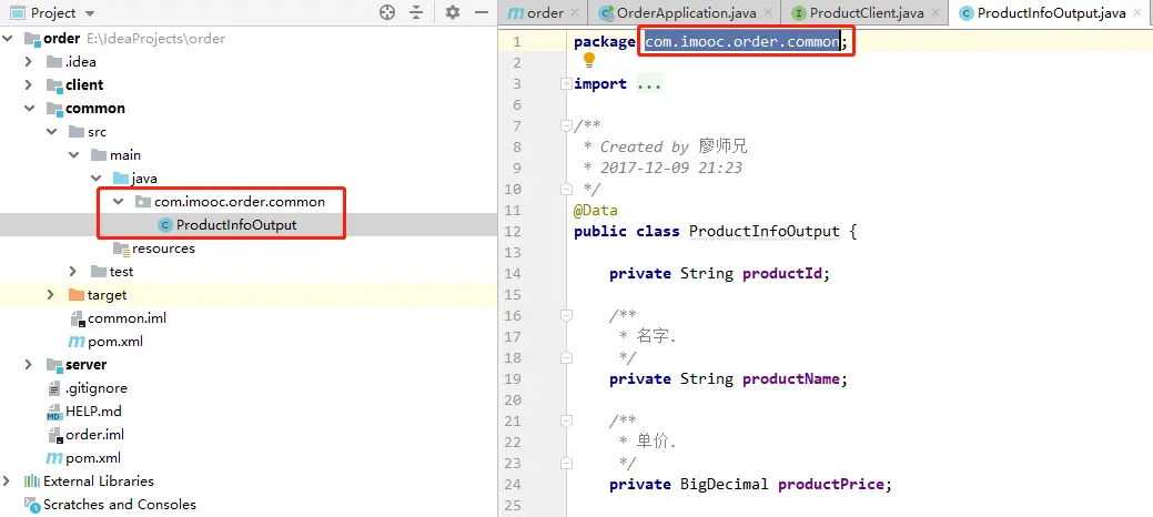 例如:我项将ProductInfoOutput移动到common子模块下,原来ProductInfoOutput的保路经为com.imooc.order.common,那么我需要在common-src-main-java下创建com.imooc.order.common包,并将ProductInfoOutput拽进去