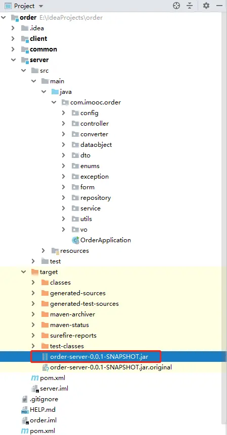 例如:我现在要打包order项目,此时我的SpringBoot运行主类在server模块下,那么我就需要以server模块为主要的打包对象