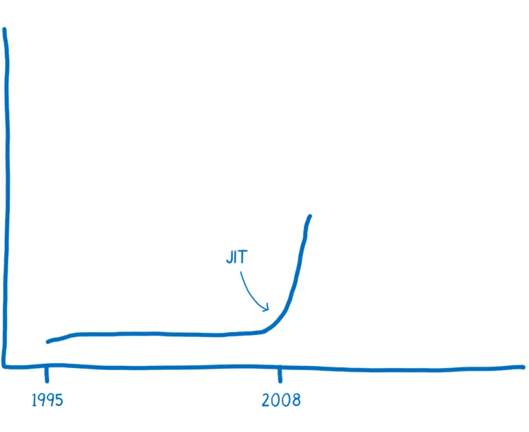 2008年浏览器性能之争的开始,许多浏览器加入了即时编译机制,也称作JITs。当JavaScript运行时,JIT可以看到模式并基于这些模式使代码运行得更快。
