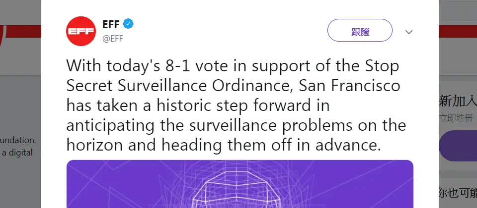 美国旧金山议会5月14日初步通过一项禁止政府单位,包括警方使用脸部辨识科技的法令,即将成为美国第一个明文禁止脸部辨识科技的城市。旧金山监督委员会以8票赞成、1票反对,一读通过了《禁止秘密监控条例》(Stop Secret Surveillance Ordinance)。本案预计在5月21日进行二读表决,正式决定这项法令的通过与否。