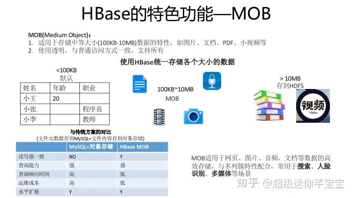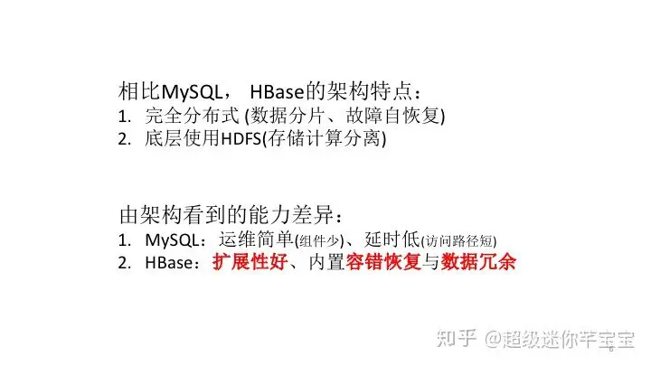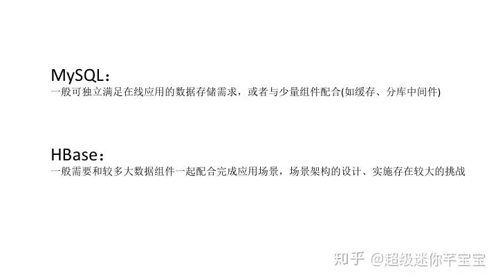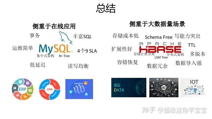 对比MySQL,一文看透HBase的能力及使用场景 芊宝宝 2019-05-16 421 阅读1分钟 MySQL + HBase 是我们日常应用中常用的两个数据库,分别解决应用的在线事务问题和大数据场景的海量存储问题。本文内容适合初次理解HBase的读者,包括技术、功能及场景,也欢迎老司机们补充和温故。原文链接本文为云栖社区原创内容,未经允许不得转载。