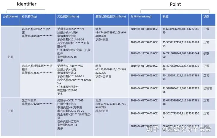 - 运输的轨迹状态数据:这个主要指药品的运输的产生的轨迹、存储容器高温低温异常事件。“轨迹溯源”可以基于这些数据实现。