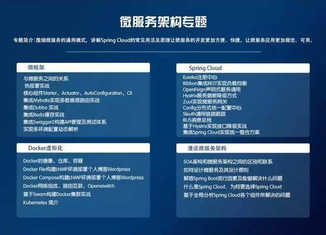 围绕微服务的通用模式,讲解Spring Cloud的常见用法及原理让微服务的开发更加方便、快捷,让微服务应用更加稳定、可用。