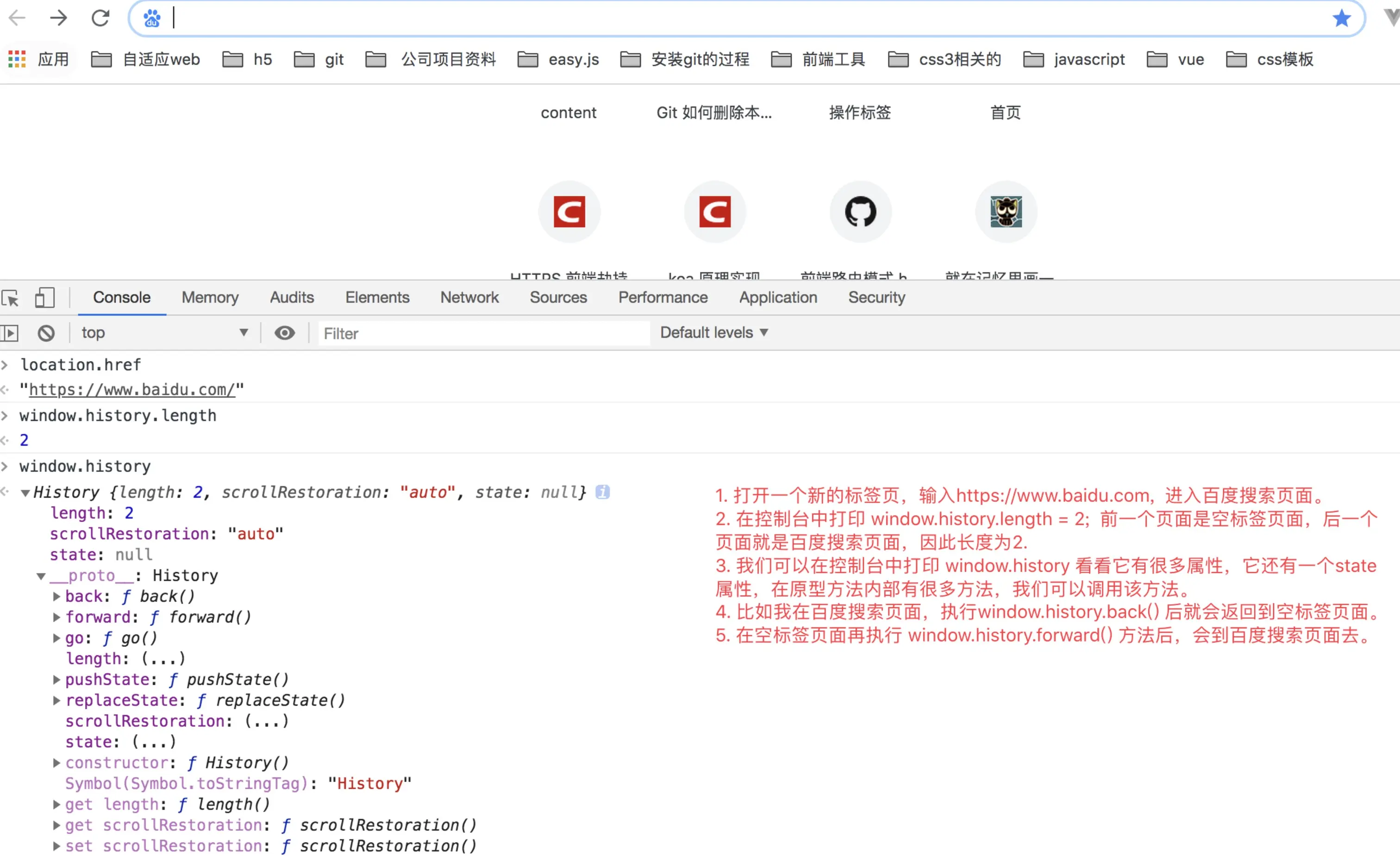 在理解路由之前,我们下面看下History API有哪些方法: DOM window对象通过history对象提供了对当前会话浏览历史的访问,在html4中有如下方法: