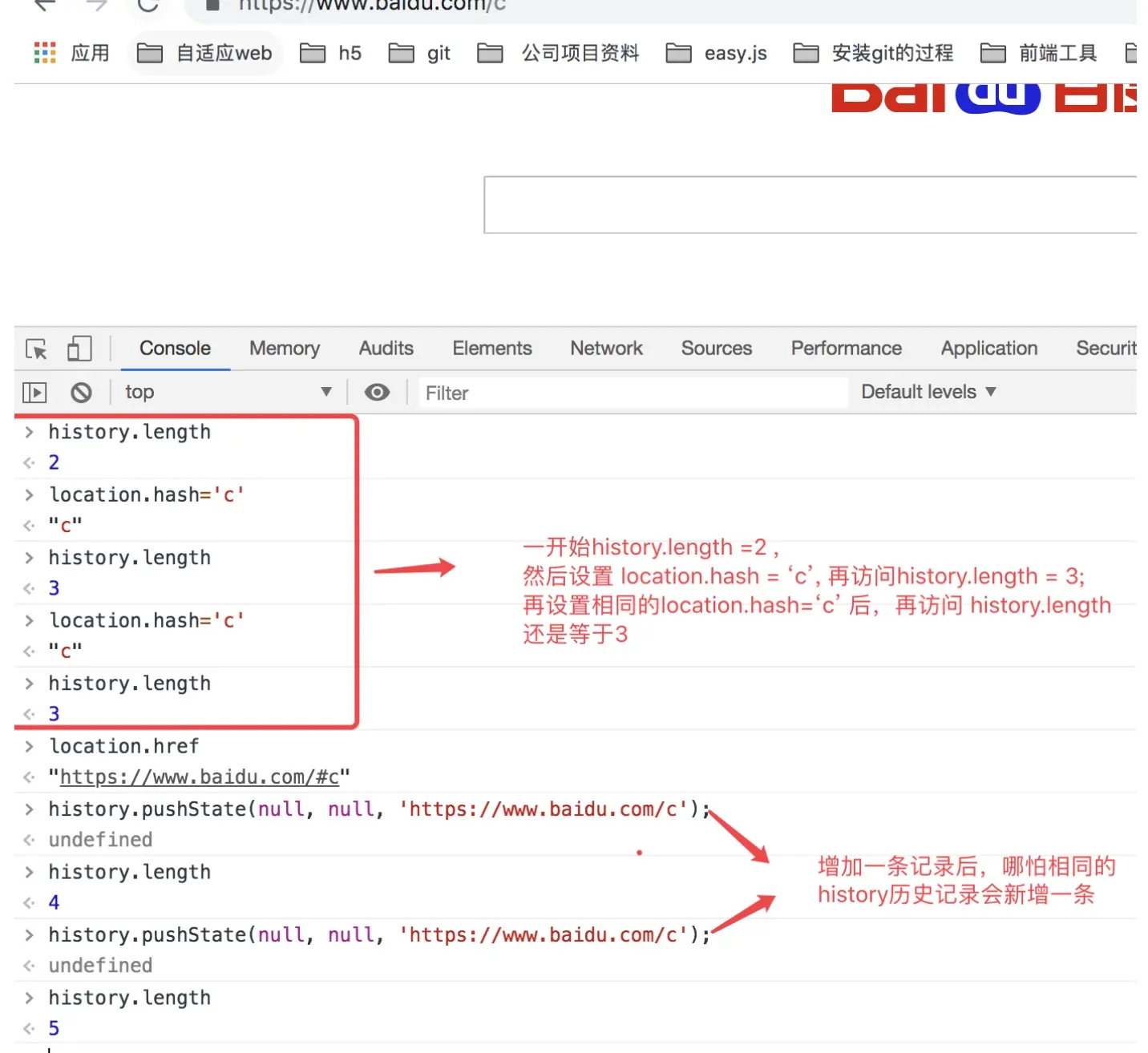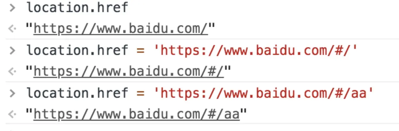 我们通过改变location.href来改变对应的url,看看是否会刷新页面,我们做如下测试可以看到,使用location.href 改变url后并不会刷新页面,如下代码在控制台中演示: