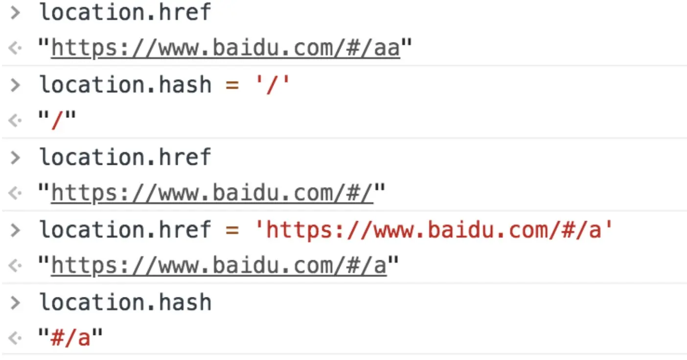 // hash是页面中的一个片段,从 # 开始的,比如 https://www.baidu.com/#/a/b 那么返回值就是:"#/a/b"