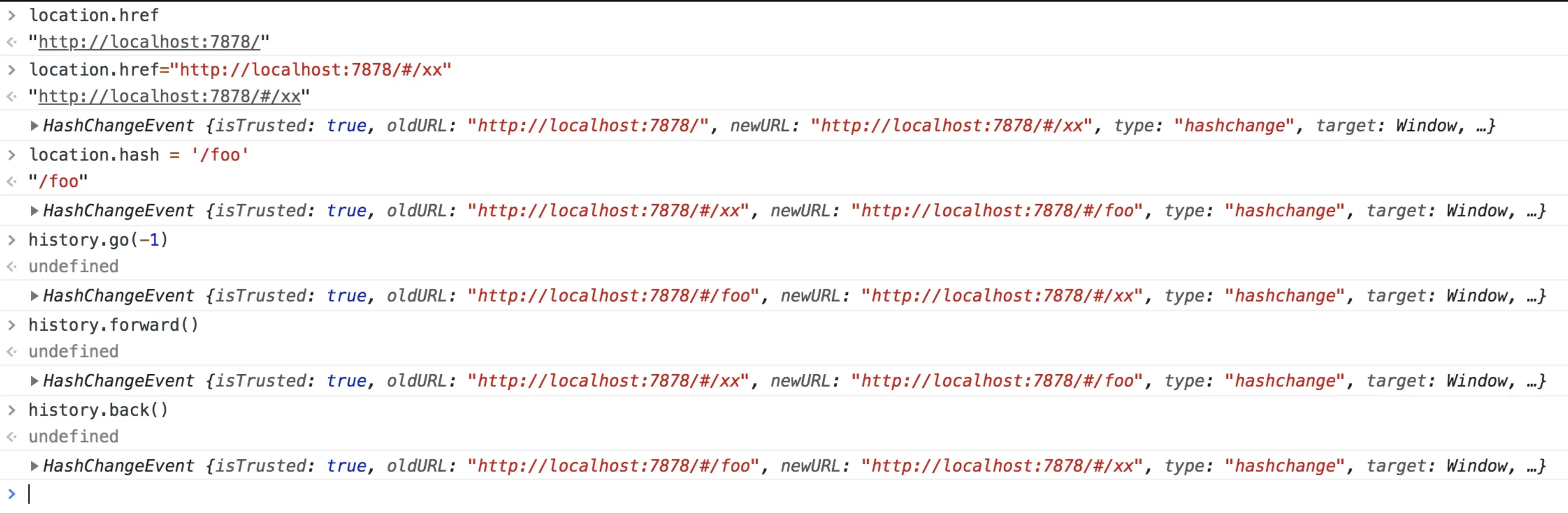 如上可以看到;不管我们是通过location接口直接改变hash值,还是我们通过history直接前进或后退操作(改变hash变化),我们都可以看到都能通过 hashchange该事件进行监听到url hash的改变。并且不会刷新页面。