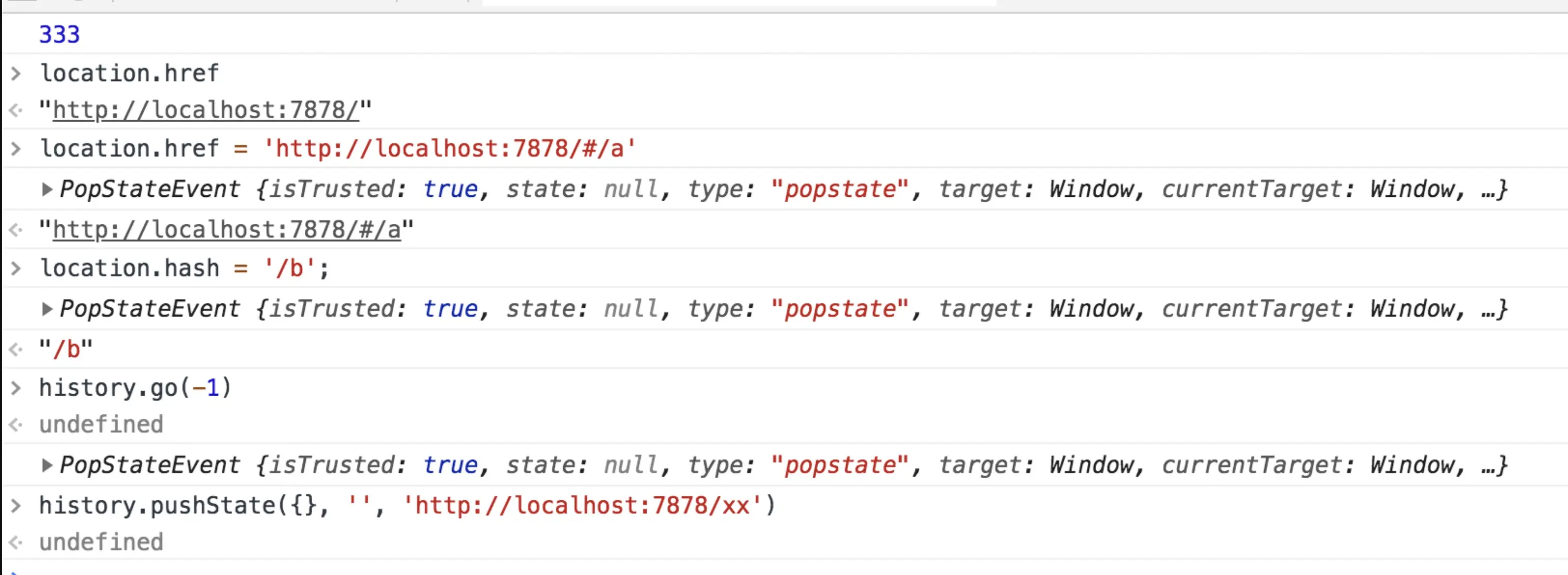 如上图所示,我们使用location.hash, history.go(-1), history.pushState 等方法操作都会触发 popstate 事件,并且浏览器的url地址也会跟着改变。只会改变url地址,且不会重新刷新页面。