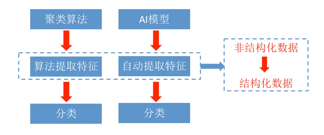 首先我们需要将非结构化数据转换为结构化数据(或者叫特征提取),这个思路可以参考图片分类任务的做法,不管是聚类算法还是AI模型,都是先做特征提取,再进行进一步处理,实际上做的就是非结构化数据转换成结构化数据。