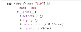 此时,你可以看到bob里面是一个Bat对象,而对象的__proto__ 多了detect和fly函数。我们给这个类加了两个方法,但并没有去修改类的原始定义。这就是原型链的继承性。