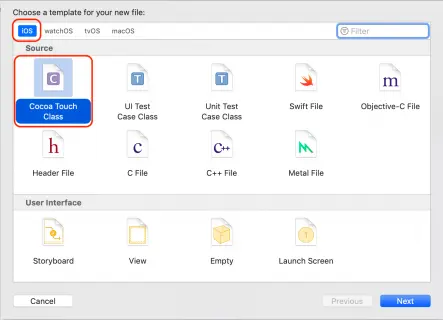 iOS▸CocoaTouch Class。 点击Next。 - 2) 将类命名为