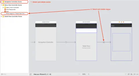 导航控制器场景(Navigation Controller Scene)不会激发快乐。 选择该场景并将其删除。 接下来,选择MenuViewController和DetailViewController之间的segue并删除它。