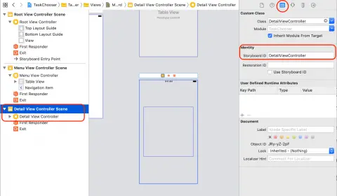 接下来,从Object层次结构中选择Detail View Controller Scene并执行相同的操作。 将Storyboard ID设置为DetailViewController。