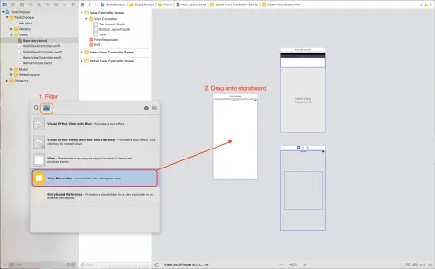 使用快捷键Command-Shift-L打开对象库,并将UIViewController的实例拖到故事板。