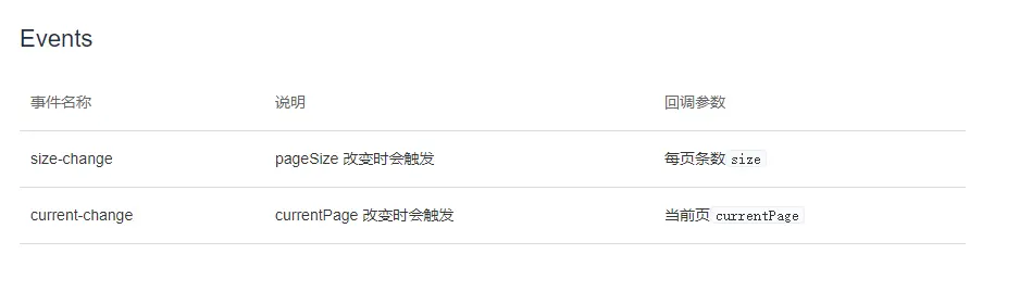 可看到element中是有两个事件:页面内显示条数的改变和当前页的改变,这里我只需要当前页改变时触发事件(current-change)就好了