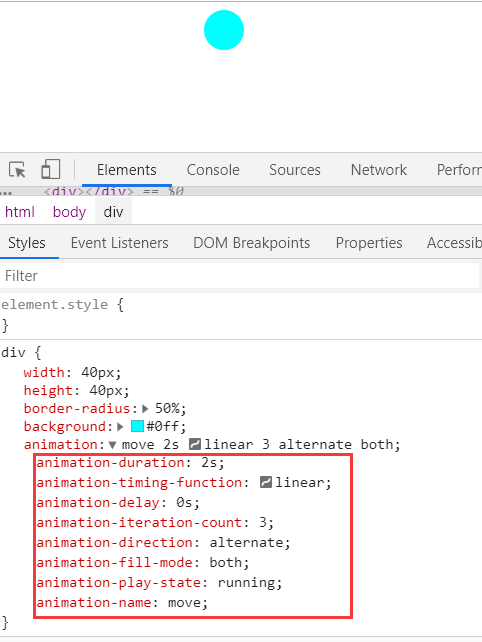 通过开发者工具可以发现,animation(动画)属性是 8 个属性的简写。