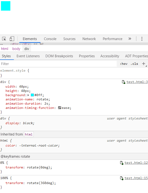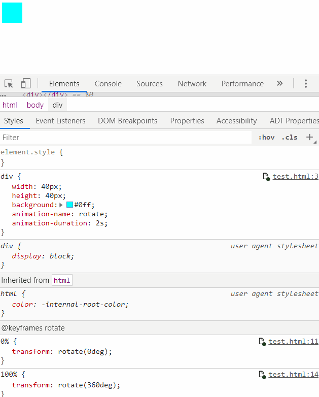 比如我们一个 div 旋转一圈,只需要定义开始和结束两帧即可: