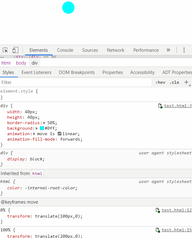 即,一个小球从向右匀速移动 200px,然后移动回来,再移动过去,最后停留在 200px 处。