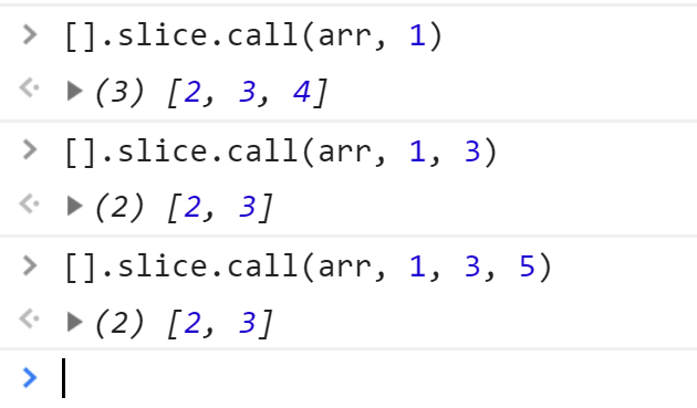 根据call()的定义, 其根本是改变this指向,那么第一个参数就是slice()的this,后续则为参数。