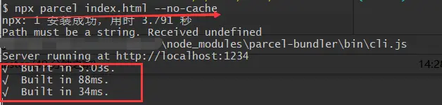 }再重新调用parcel,我们会发现问题依旧存在。这是因为parcel读取了刚才的缓存文件。同样有两种解决方法。第一种禁用缓存(推荐)