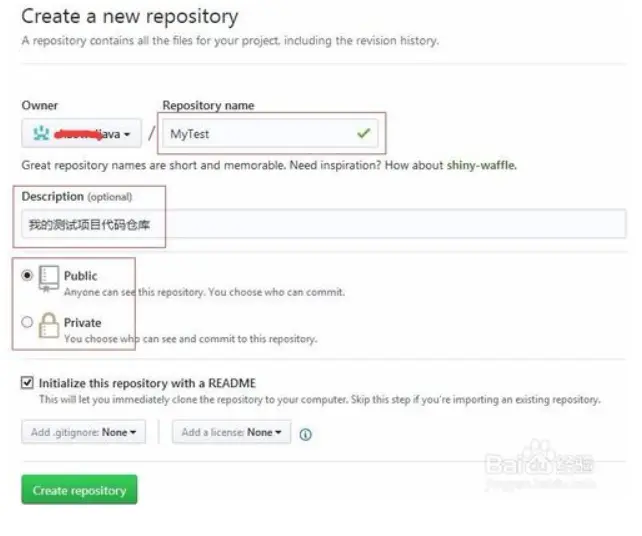 2.设置一个仓库名称,添加一个描述信息,选择公开或私有,再勾选初始化一个README文件,最下面是开源协议,可以根据自己需要选择