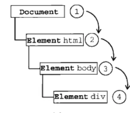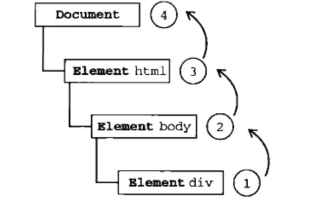 Netscape communicator团队提出了另一种事件流叫做事件捕获。事件捕获的过程呢?则是从document开始一直传递到div的过程: 1、document 2、 html 3、 body 4、 div 示意图如下: