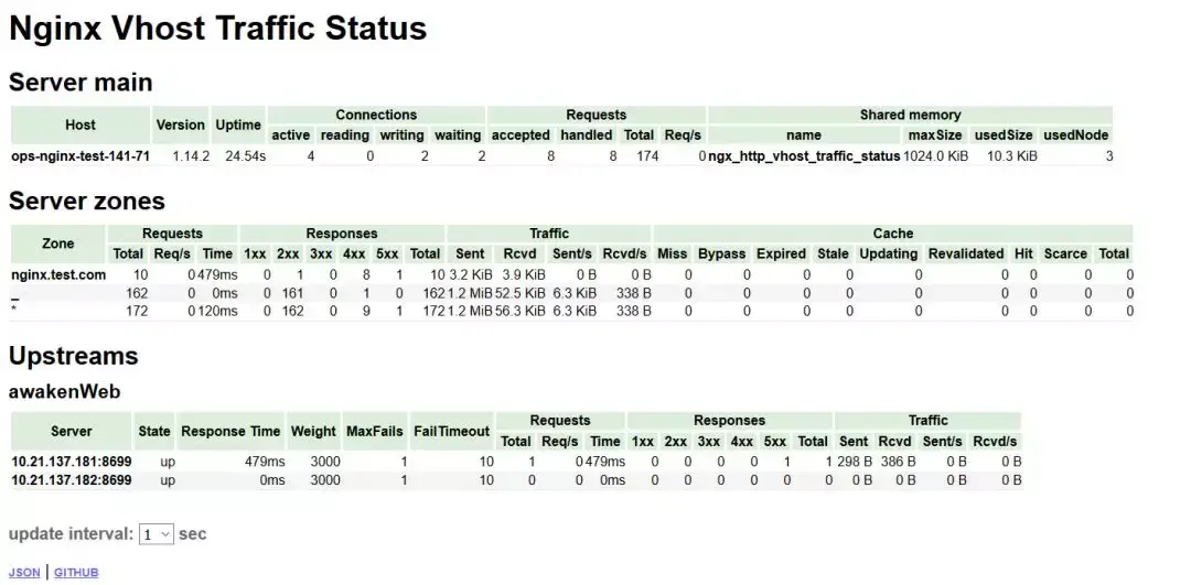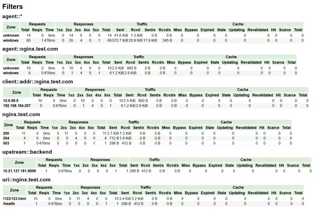http { vhost_traffic_status_zone; server { listen 8088; location /status { vhost_traffic_status_display; vhost_traffic_status_display_format html; } }}