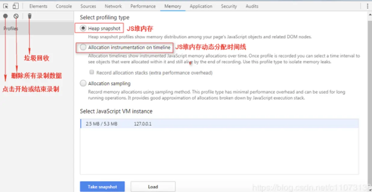 Heap snapshot(JS堆快照),Allocation instrumentation on timeline(JS堆分配时间线),Allocation sampling三种堆快照类型 - 开始录制前先点击垃圾回收,再点击录制,单如果是js堆内存动态分配时间线的话,结束之前要再次点击下垃圾回收,再结束录制。
