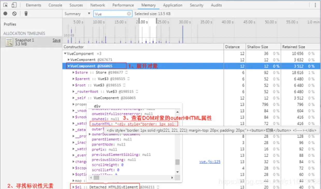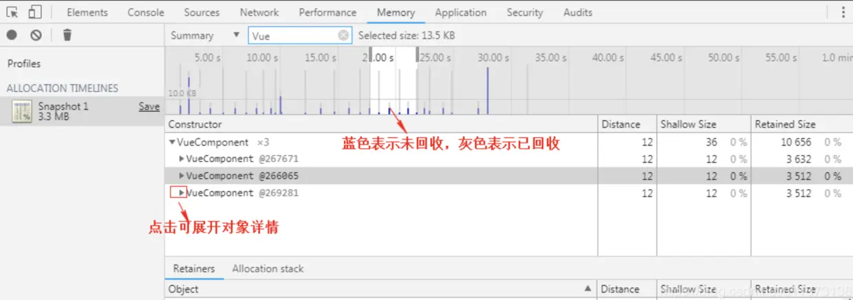 上面是Vue项目反复切换两个录制的堆分配行为,我们可以聚焦到某一次堆分配,查看具体对象信息。可以在柱状图中滑动鼠标滚轮查看某段时间的堆分配。比如上面发现有三个VueComponent没有回收。点击展开查看详细信息。发现这三个组件的信息都是一样的,那就是组件没有释放。首先确认组件是否被销毁。如果已销毁,确认事件是否解绑、定时器是否取消,特别注意事件总线绑定的事件一定要解绑。