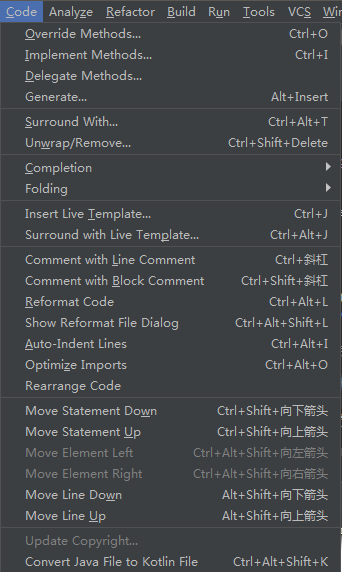 这都是些和编码相关的,重写方法,实现方法,环绕(try…catch,if…else,…),上面显示的快捷键基本都需要记住,因为是比较常用的。