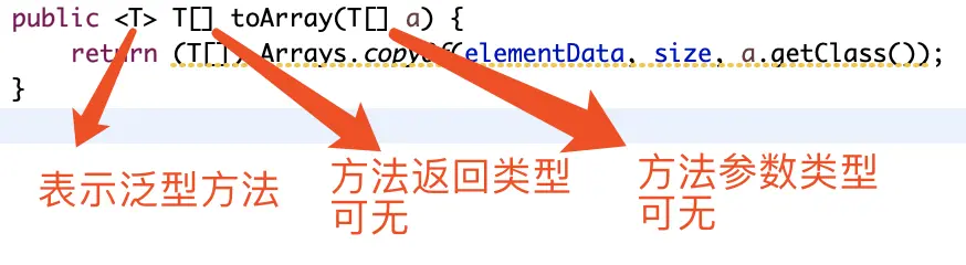 不过,说实话,泛型方法的定义看起来略显晦涩。来一副图吧(注意:方法返回类型和方法参数类型至少需要一个)。