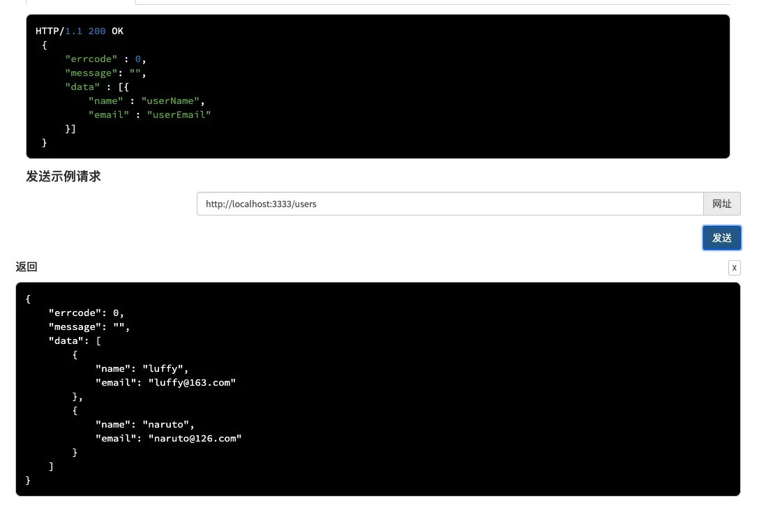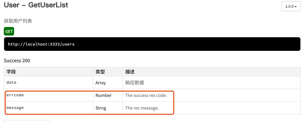 /** * @api {get} /users * @apiDescription 获取用户列表 * @apiName GetUserList * @apiGroup User + * @apiSuccess {array} data 响应数据 + * @apiSuccess {string} message 响应消息 + * @apiSuccess {number} errcode 错误码(自己定义,0为无错误) * @apiSuccessExample {json} Success-Response: * HTTP/1.1 200 OK * { * "errcode" : 0, * "message": "", * "data" : [{ * "name" : "userName", * "email" : "userEmail" * }] * } * @apiSampleRequest http://localhost:3333/users * @apiVersion 1.0.0 */