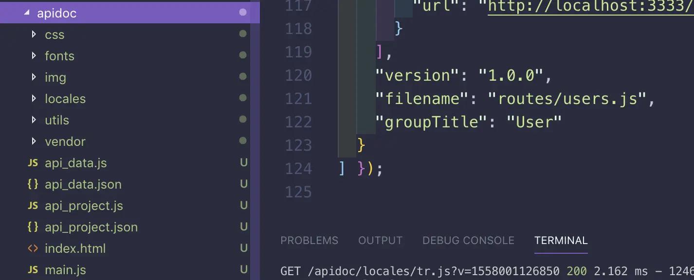 apidoc -i routes/ -o public/apidoc/,熟悉node的同学应该都清楚,routes就是后端路由,也就是api的位置,apidoc监听的是routes/目录的所有文件,然后输出到public/apidoc/目录中,这里其实随意,你输出到哪里都可以,因为它的输出就是一套静态文件,带样式的html。那么既然是node服务,我起的静态服务器就是public,我将生成的文件放到public/apidoc/文件夹下,项目启动其实服务也就可以被访问了,一举两得,很方便。所以上面apidoc.json我写了preview-url: http://localhost:3333/apidoc/index.html。