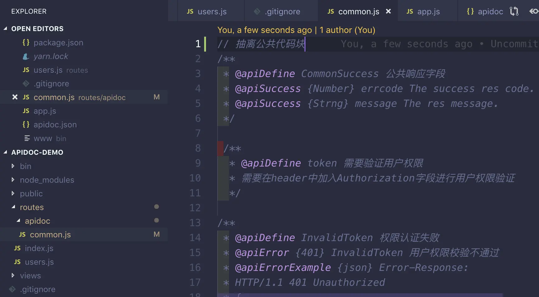 这里就不是一个注解了,就是我认为项目规范里值得提一点的地方,就是说其实我们抽离出来的代码块是可以统一管理的,而不必要每个文件都单独管理。单独抽离出来我统一放到了/routes/apidoc/common.js里面,然后其他路由文件正常使用就可以,看起来项目整体就更规范了。仁者见仁智者见智,当项目庞大的时候,还可以将响应再单独封装,这就看自己的需要了~