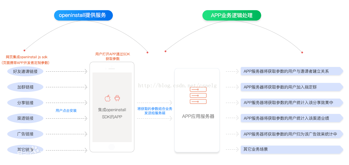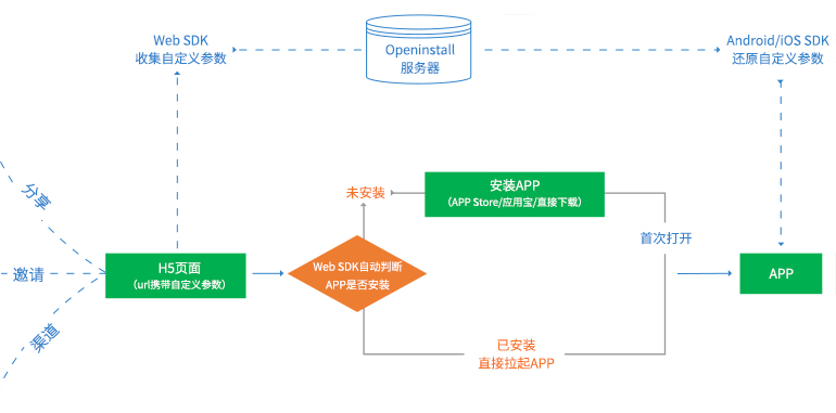3、用户通过该 H5 页面安装 APP(包括跳转APP Store、Android各大应用市场、直接下载等)并首次打开时,openinstall Android/iOS sdk 将从 openinstall 服务器取回暂存的参数进行匹配;如果用户已安装 APP,则点击链接时直接唤醒 APP 并还原内部场景页面,同时进行参数匹配。