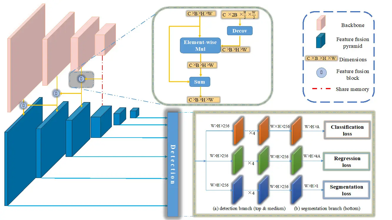 另外,DFS 算法提出了一种辅助训练单阶段检测器的语义分割分支(Semantic Segmentation branch),促使检测网络以一种自监督的方式实现注意力机制以及学到更好的特征。具体地说,DFS 算法独特的语义分割分支分层地利用更强的语义分割监督信息监督训练网络,使得用于预测人脸的各级特征图专注于各自最适宜检测到的不同尺寸的人脸。