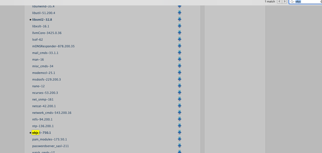 - 我们点击最新的 10.14.1 加入下载源码界面(这里的源码比较多,你可以使用 Command + F )就行搜索,界面将会出来你想要的 objc4-750.1