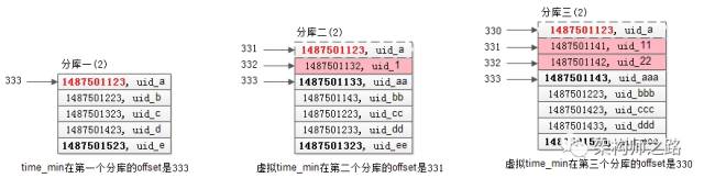 在第三个库中,(1487501143, uid_aaa)的offset是333(根据第一次查询条件得出的),故虚拟time_min在第三个库的offset是330;