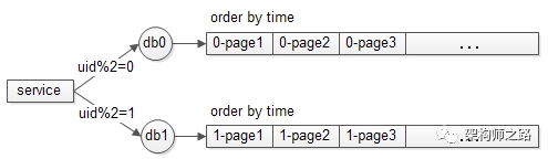 例如,在uid随机的情况下,使用uid 取模分两库,db0和db1: