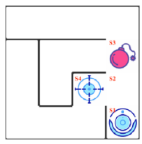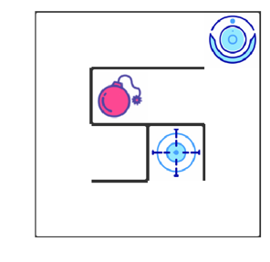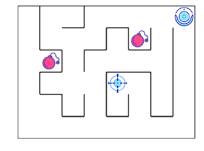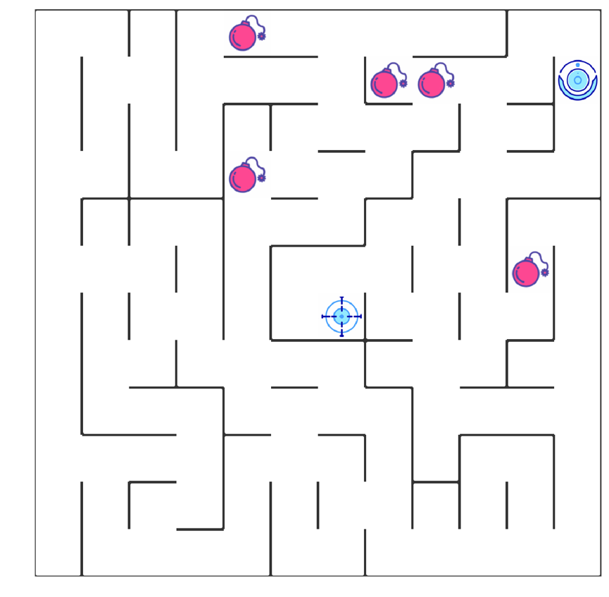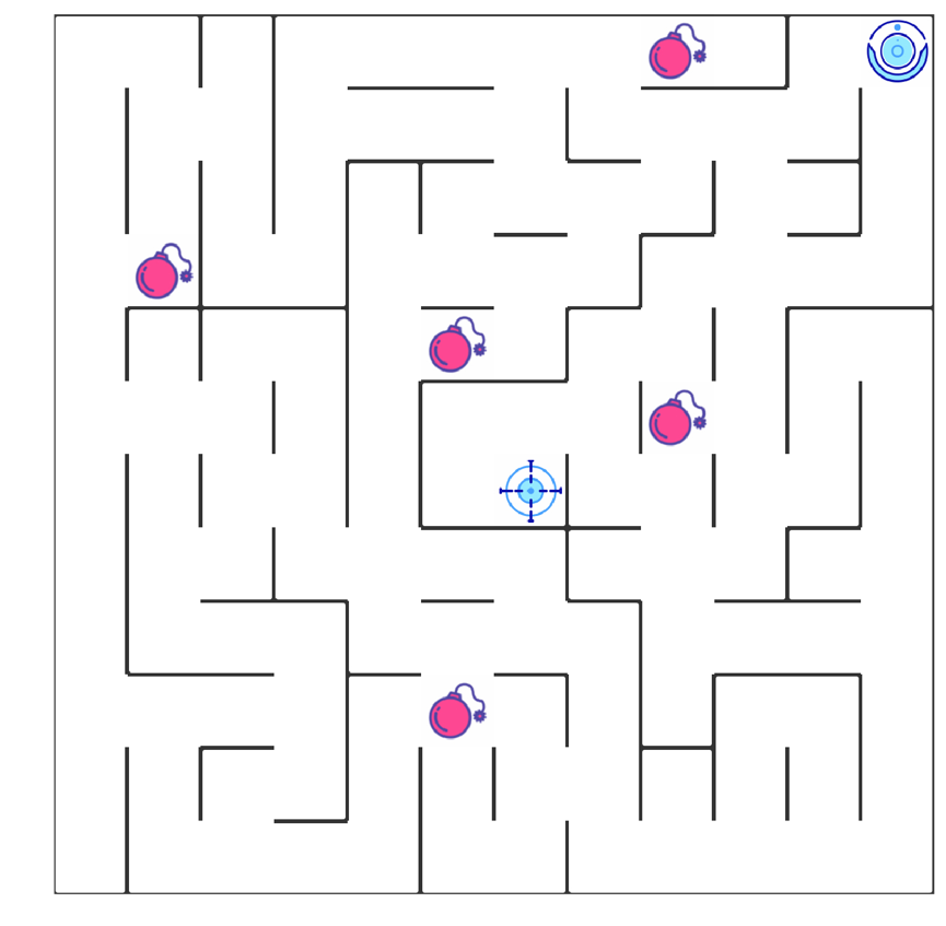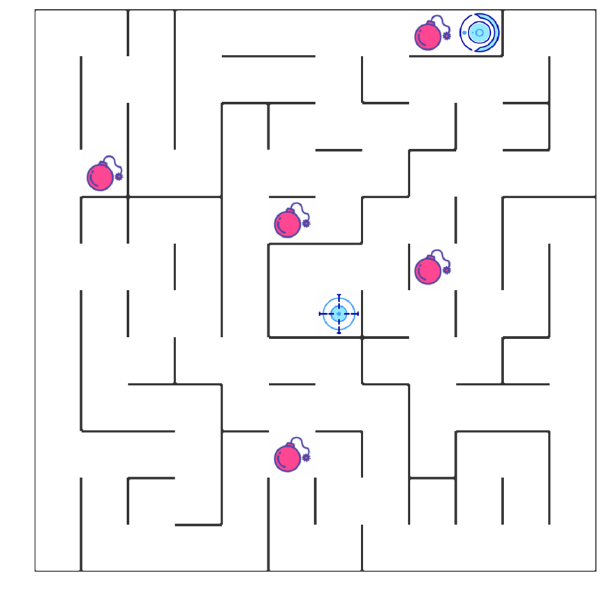 如上图所示,智能机器人显示在右上角。在我们的迷宫中,有陷阱(红色炸弹)及终点(蓝色的目标点)两种情景。机器人要尽量避开陷阱、尽快到达目的地。
