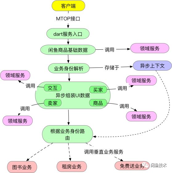 垂直业务路由:我们使用dart中的zone存储每个闲鱼商品的业务标识,代码生成的静态代理类依据业务标识调用相应的服务,在主干数据里填充各个业务的独有数据。zone是dart异步代码的执行环境,能够缓存一些可重用数据(业务代码里除非非此不可,尽量不要多用)