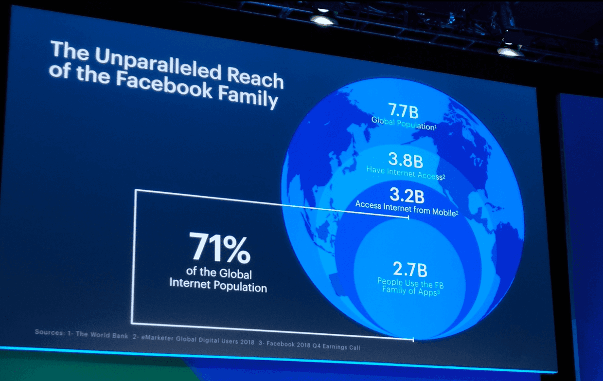 如图,全球38亿互联网用户(含PC和移动)中,有71%(27亿)用户使用了Facebook家族的产品。由于在中国无法访问,如果去除中国互联网群体影响(中国互联网用户占全球20%),Facebook在海外市场的用户覆盖达到了90%之多,是海外关系领域的绝对主导者。海外APP做用户增长,多数离不开Facebook,也难怪F8会有较多市场、产品等非技术人员参加。