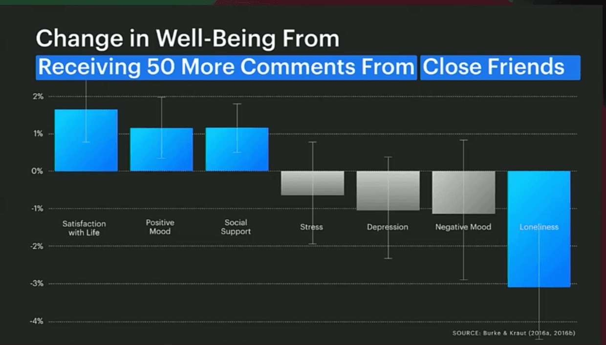 研究者不断调整场景,当用户不是被动消费别人的消息,而是收到了来自亲密朋友的50个评论互动时,幸福感增加了很多。见下图。密友的互动带来的幸福感提升,可以应用到其他产品设计中。