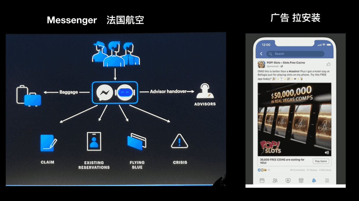 以法航为例,用户可以在Messanger上完成询单、包裹提醒、投诉、预订等多种操作,目前超过80%的用户通过Messanger与法航交流。此外,企业甚至可以购买广告,在Facebook上直接唤起App安装,这方面比国内更开放。