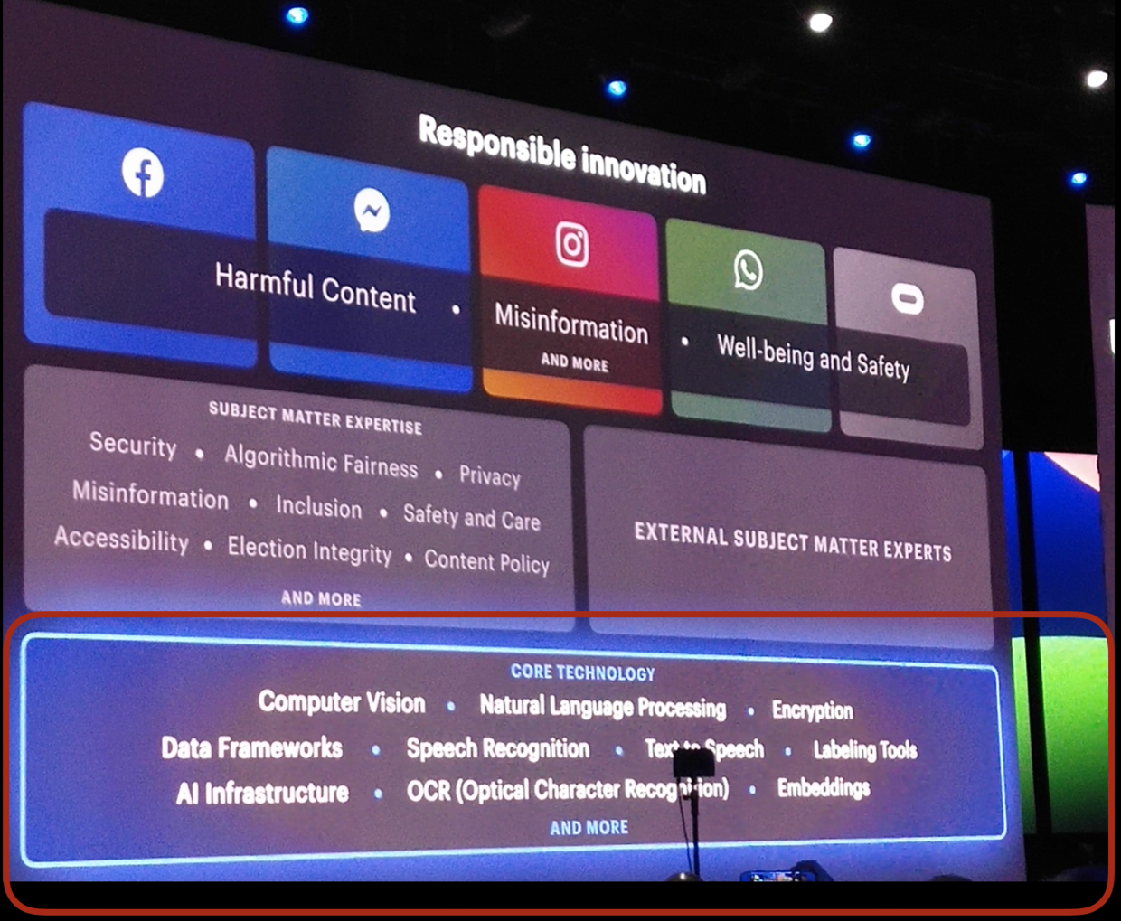 从愿景,到业务,再到如何用技术来支撑。请原谅手机的拍照效果。可以从这个图里了解到Facebook未来的主要技术方向,不难理解,语言识别、文字、图片技术,对Facebook很重要。AR、VR可以增强用户间的交互体验。