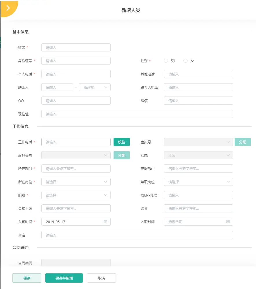 比如人源库中,新增人员的侧滑表单,对人员信息进行了分类,分为四个模块:基本信息,工作信息、合同信息、人脸识别,而且标注有必填项符号,可以直接看到哪些是必填,哪些不必填