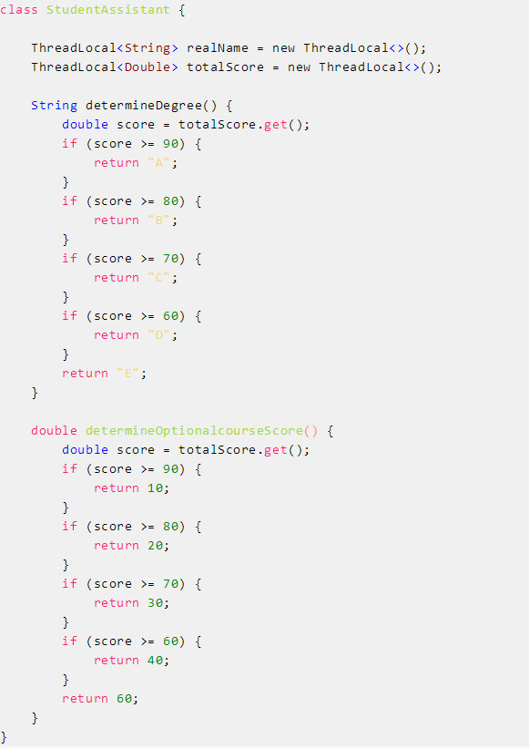 这个学生助手类有两个成员变量,realName和totalScore,都是ThreadLocal类型的。每个线程在运行时都会拷贝一份存储到自己的本地。